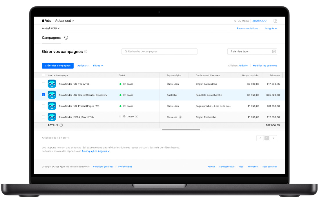 Le tableau de bord Campagnes est la première page qui s’affiche lorsque vous vous connectez à votre compte Apple Ads. Vous pouvez également accéder à la liste de vos campagnes en cliquant sur le nom de votre compte dans le menu Compte situé en haut à droite de la page.