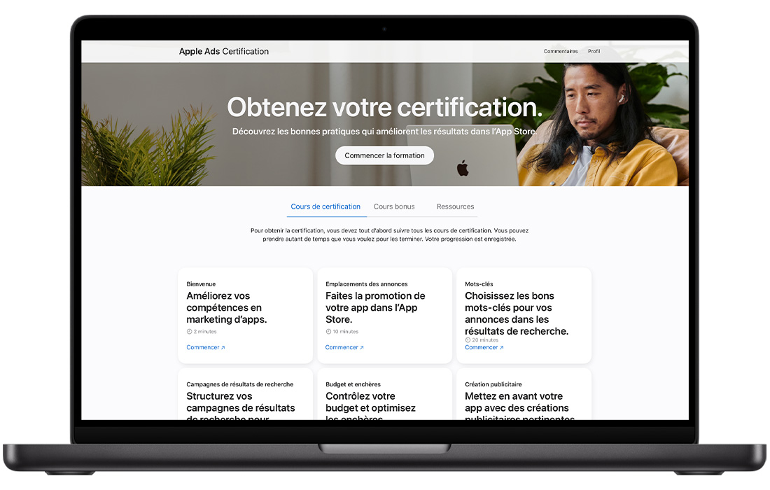 Acquérez les compétences et les connaissances en marketing d’apps qui vous aideront à améliorer les performances de vos campagnes. La certification Apple Ads est une ressource en ligne complète qui vous permet de :