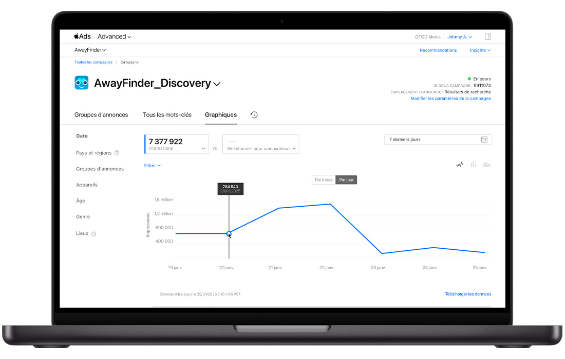 Le tableau de bord Graphiques d’Apple Ads vous permet d’afficher les performances par date, pays et régions, groupes d’annonces, mots-clés, appareils ou paramètres d’audience, et de représenter visuellement les statistiques suivantes :