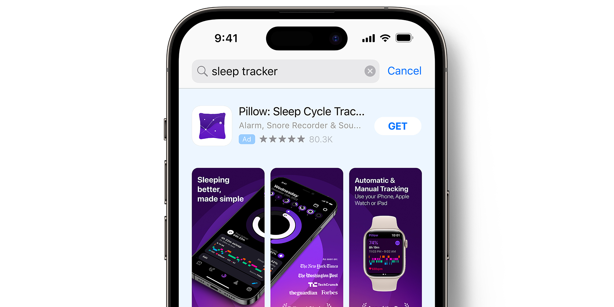 L’équipe Pillow a créé des variantes d’annonces à partir des pages de produits personnalisées configurées dans App Store Connect afin de créer des expériences de l’App Store plus pertinentes et plus attrayantes pour certaines audiences. Ces annonces personnalisées présentaient des caractéristiques, des fonctionnalités et des avantages uniques répondant aux besoins et aux objectifs de différentes audiences. Par exemple, sur certaines pages de produits personnalisées, l’équipe mis l’accent sur le suivi du sommeil dans l’Apple Watch à l’intention des personnes souhaitant bénéficier de cette fonctionnalité. D’autres pages de produits personnalisées ciblaient les clientes et les clients souhaitant suivre leur sommeil sur leur iPhone et présentaient cette fonctionnalité de l’app.