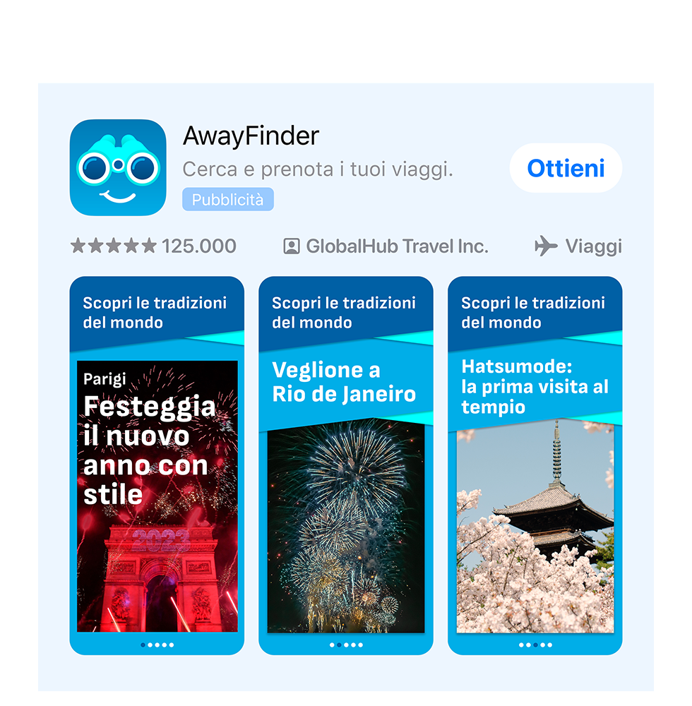 Se promuovi l’app di viaggi AwayFinder, potresti mostrare immagini di festeggiamenti per il Capodanno all’interno del tuo annuncio personalizzato a dicembre per favorire i download da parte di chi viaggia intorno alla fine dell’anno.