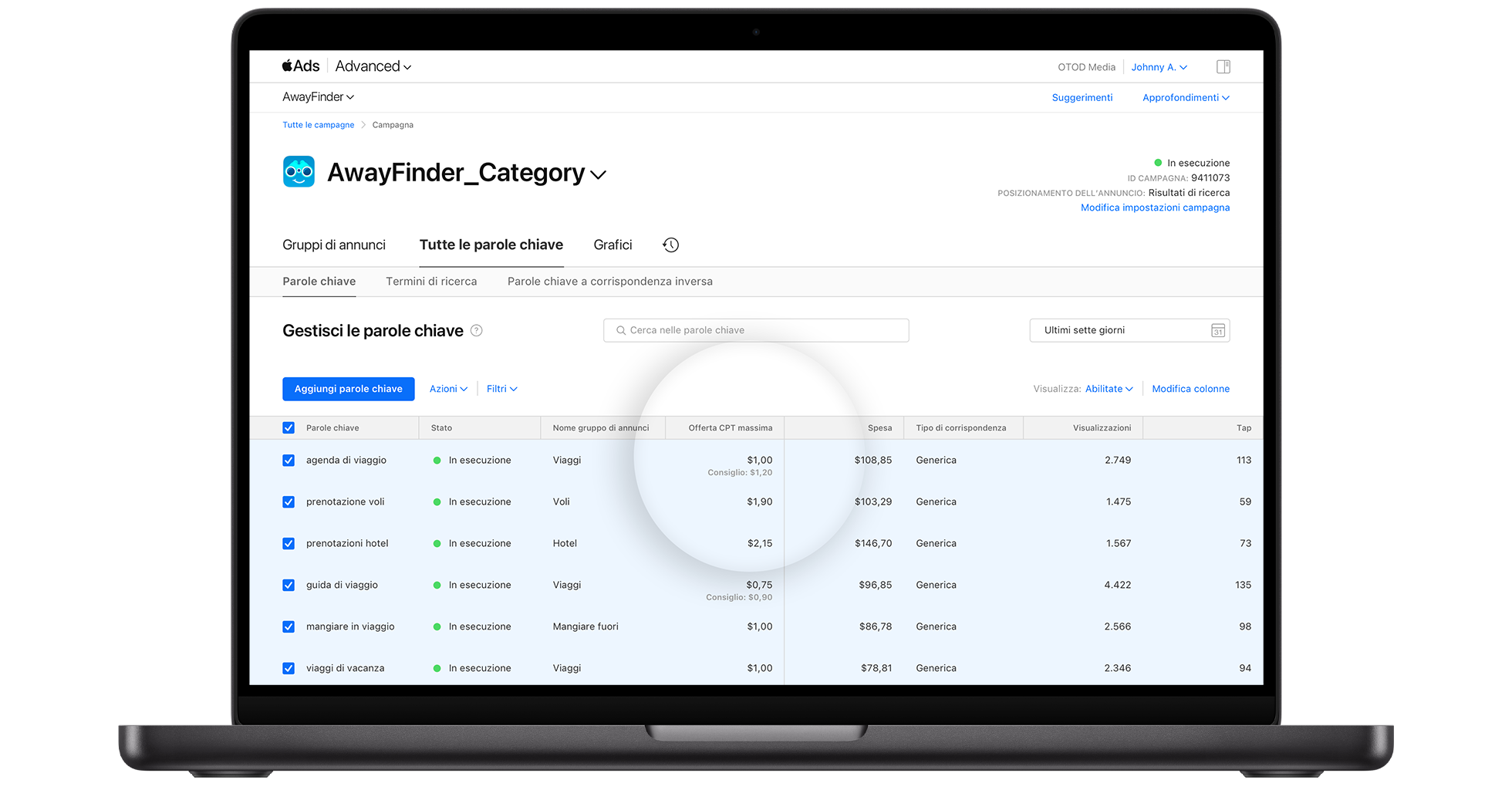 Per ottenere il massimo dai trend e dalle opportunità stagionali, puoi variare periodicamente le tue offerte CPT massime per le parole chiave esistenti oppure aggiungere nuove parole chiave con offerte più competitive.