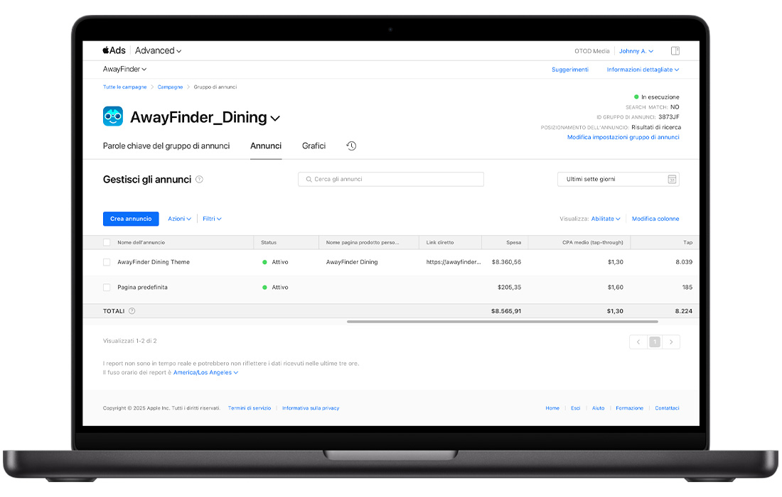 App Store Connect. - Monitorare i dati di performance relativi al presente e al passato per tutte le varianti degli annunci, compresi l’annuncio predefinito per i risultati di ricerca, gli annunci personalizzati e i Creative Sets creati in precedenza. Puoi visualizzare le metriche chiave, come ad esempio visualizzazioni, tap, costo-per-tap medio, installazioni e molto altro.
