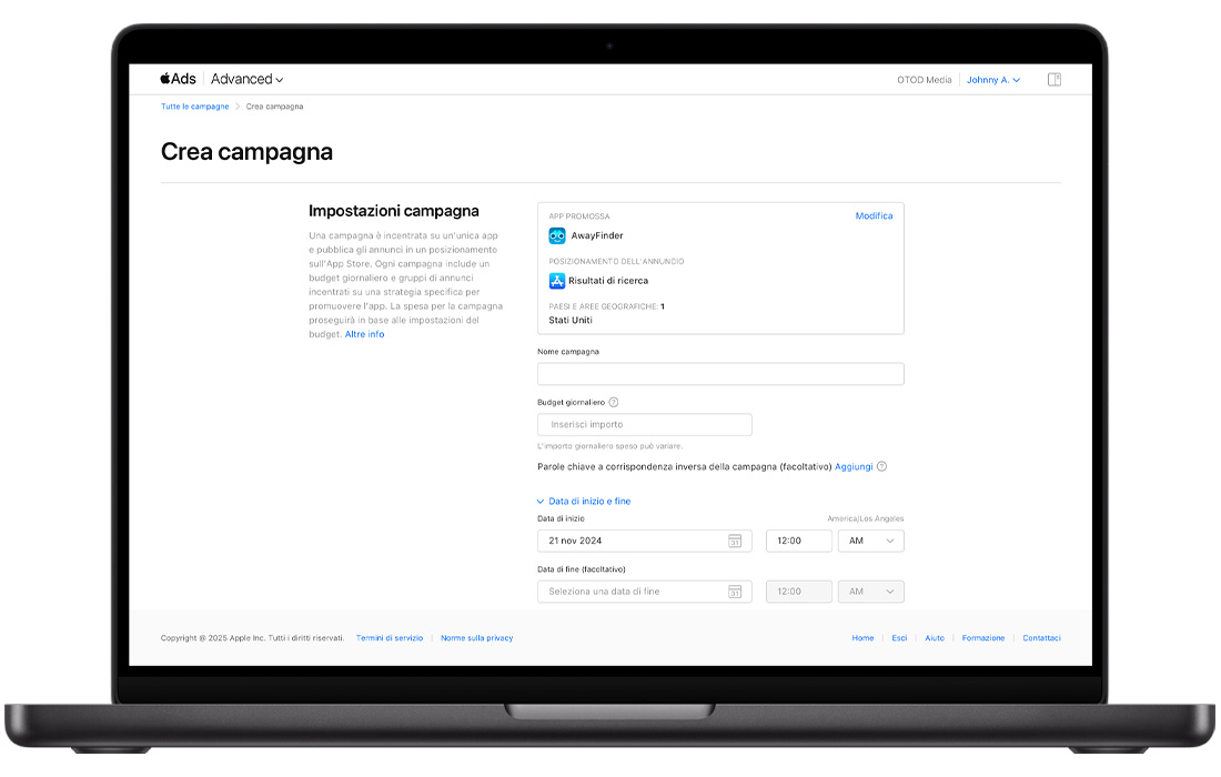Puoi programmare le tue campagne Apple Ads durante la creazione della campagna oppure modificando le impostazioni della campagna. La programmazione delle campagne è utile per le promozioni stagionali, le campagne di marketing da utilizzare per un determinato periodo di tempo ed eventi specifici. Se, ad esempio, avessi un’app che supporta un evento annuale, potresti programmare la tua campagna in modo che sia in linea con l’app.
