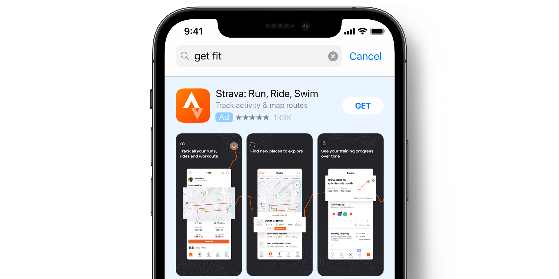 Per aumentare ulteriormente la rilevanza per i singoli utenti, il team di Strava ha creato più varianti di annunci tramite i Creative Sets, con gli screenshot e le anteprime della pagina di prodotto sull’App Store. Prima di utilizzare i Creative Sets, l’approccio di Strava consisteva nell’uso di contenuti creativi generici per raggiungere un target di pubblico ampio. Grazie ai Creative Sets, il team ha allineato i contenuti creativi pubblicitari ai temi delle parole chiave e ha messo in evidenza le funzionalità dell’app per ogni tipo di attività.