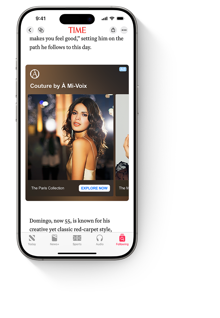 I nostri annunci consentono al tuo marchio di entrare a far parte dell’esperienza di lettura in Apple News e in Borsa su iPhone, iPad e MacBook.