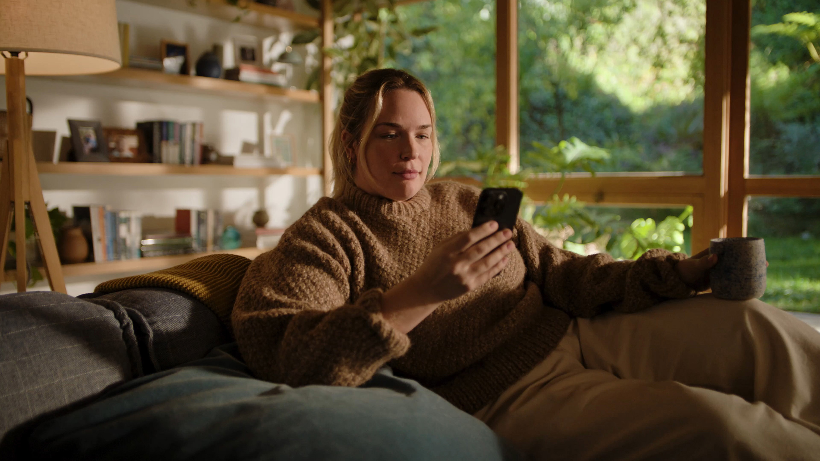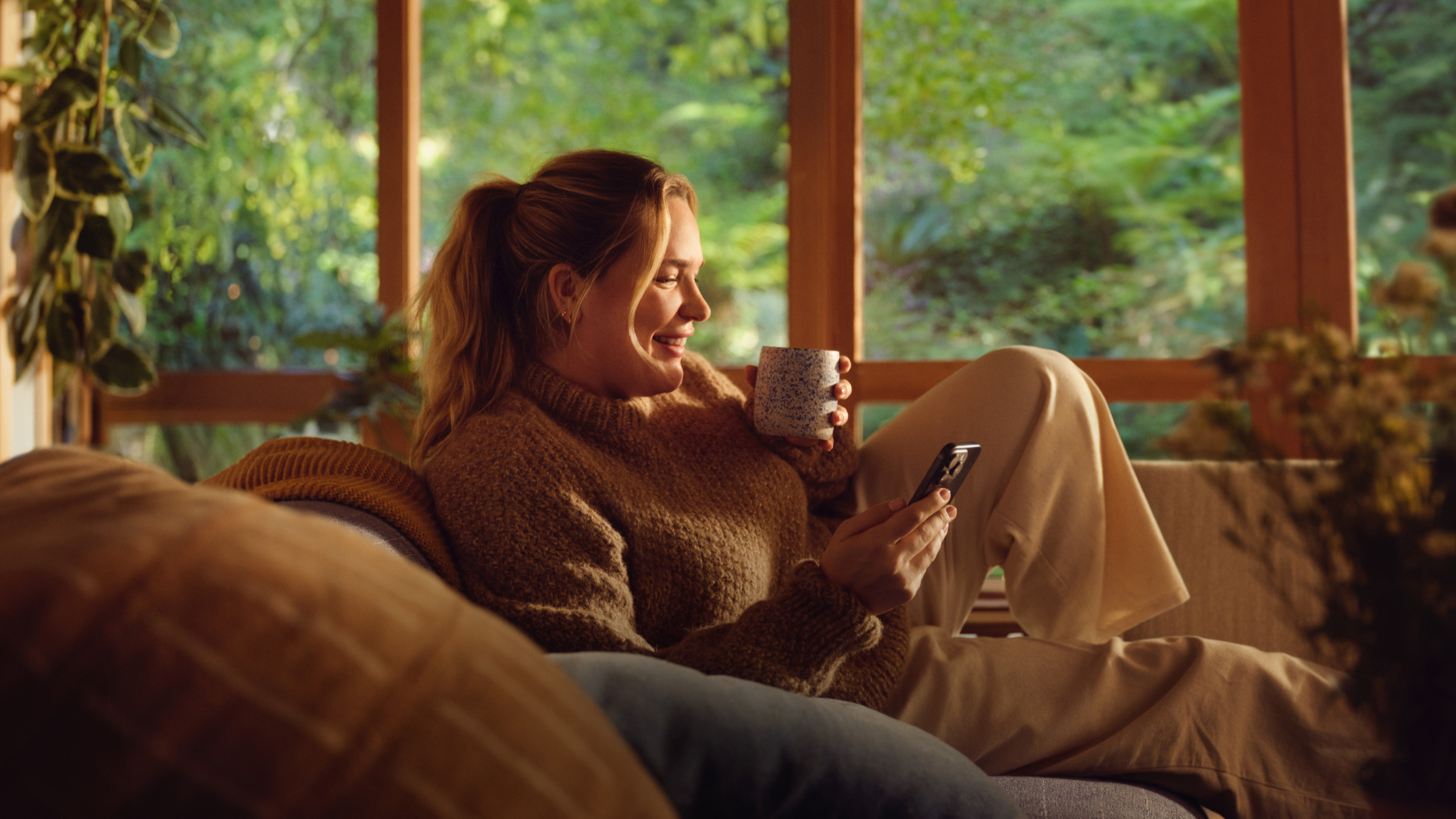 午前中にソファに座ってコーヒーを飲みながら、笑顔でiPhoneを見ている女性。 午前中にソファに座ってコーヒーを飲みながら、笑顔でiPhoneを見ている女性。