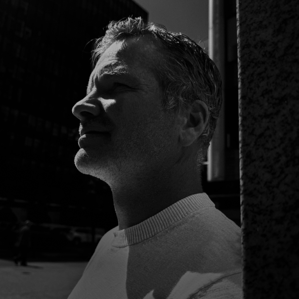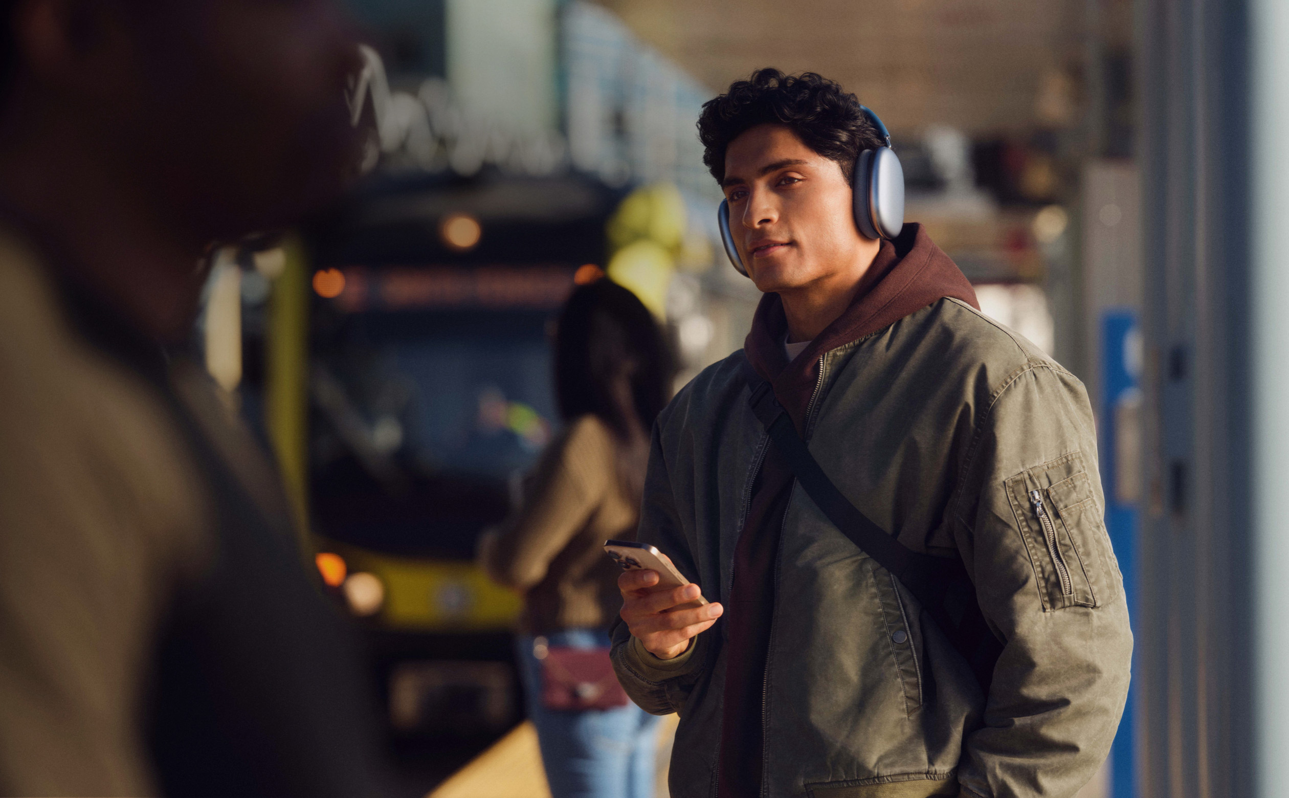 通勤電車が近づく駅のプラットフォームに立っている人。手にiPhoneを持っている。