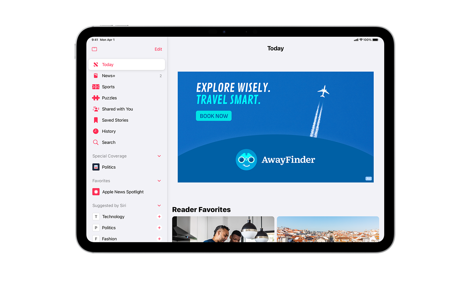 iPadでApple NewsアプリのTodayフィードが開いている。画面の上部にはサンプル旅行会社AwayFinderの広告が表示されている。