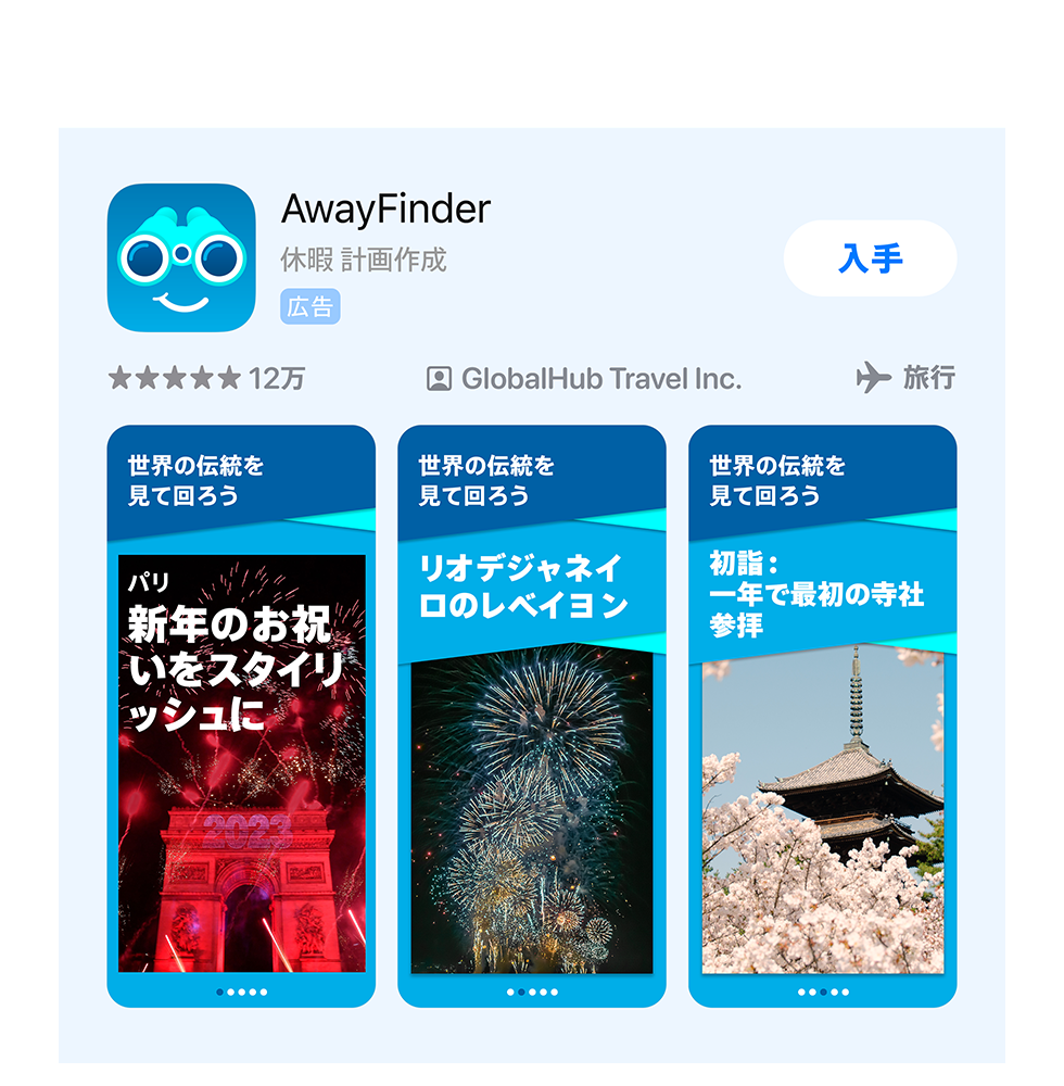 たとえば、AwayFinderという旅行アプリのプロモーションを行っている場合、12月にはカスタム広告内に新年を祝う画像を表示して、年末に旅行するユーザーによるダウンロードを促すことができます。