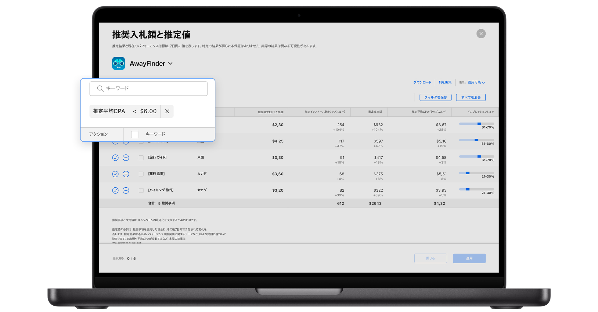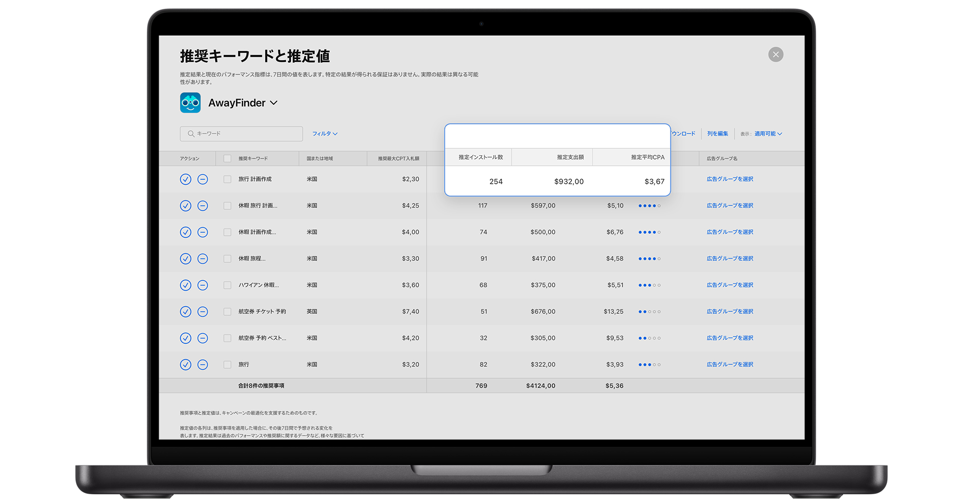 Apple Adsでは、推奨事項が毎日更新されます。検索結果広告向けの最新の推奨キーワードと推奨入札額や、すべてのプレースメント向けの1日の予算の推奨額を確認することができます。