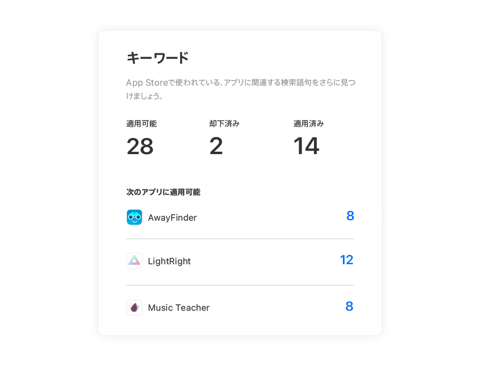App Storeでそのキーワードを検索した人数に基づいて、各キーワードの人気度を把握します。検索の人気度は1〜5までで表され、5が最も人気があることを示します。この指標を確認すると、キーワードの機会をより適切に評価できます。