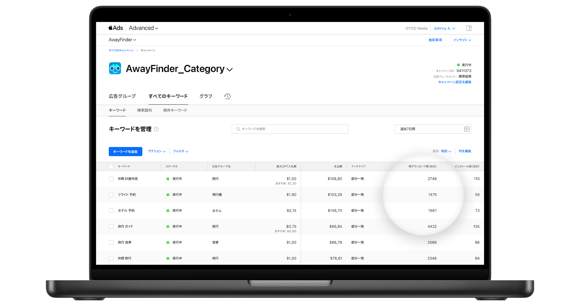 適切な価値提案で適切なユーザーのエンゲージメントを促すことで、コンバージョンの可能性が高いユーザーを再獲得することができました。他の有料チャネルを利用して再獲得したユーザーと比較して、Apple Adsを使用することで、以前アプリをダウンロードしたことのあるユーザーによる収益が平均で3倍増加しました。