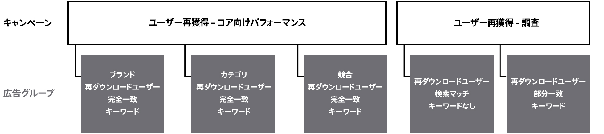 再ダウンロードが最適化されるよう広告グループを構成する。
