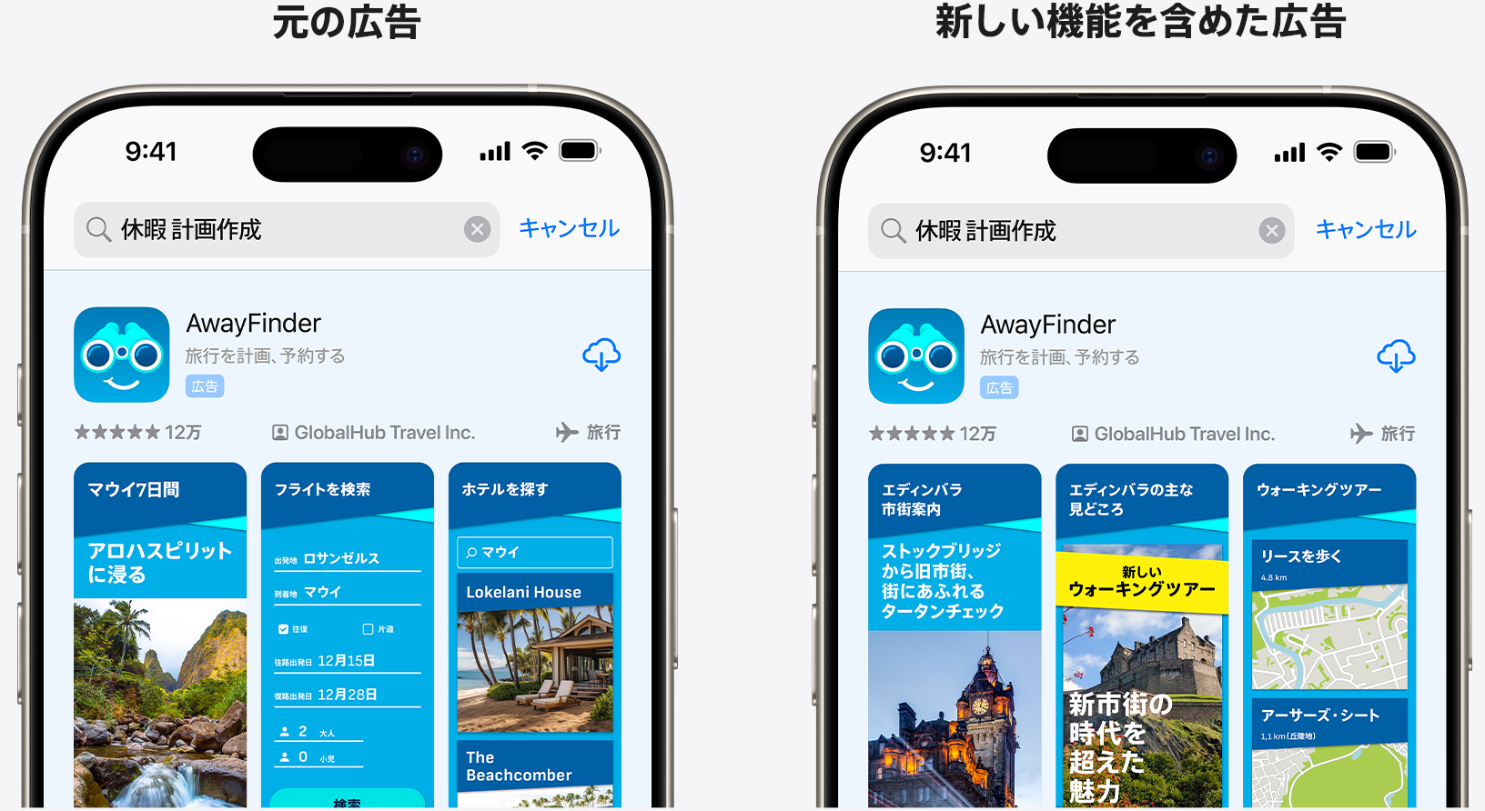 たとえばAwayFinderという旅行用のアプリの、新しいウォーキングツアーの機能をアピールしたいとします。新しいアセットをApp Store Connectにアップロードすることで、この新しい機能を新規および過去のユーザーに宣伝できます。