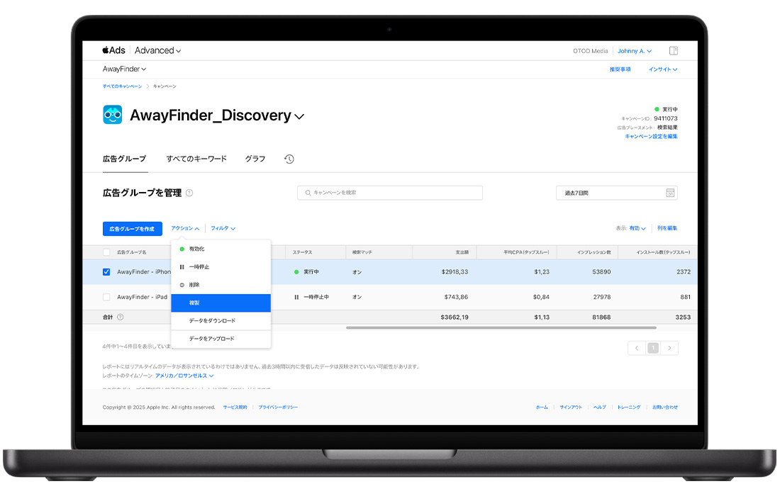 - 複製する広告グループを1つまたは複数選択します。キャンペーンは、同じタイプの広告プレースメントにしか複製できません。検索結果キャンペーンは検索結果キャンペーンとしてのみ、TodayタブキャンペーンはTodayタブキャンペーンとしてのみ複製できます。