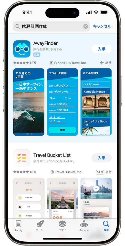 検索結果広告を使うと、ユーザーがダウンロードするAppを探しているまさにそのときにあなたのAppを見つけてもらえます。ユーザーがApp Storeで検索すると、検索結果の最上位に広告が表示されます。