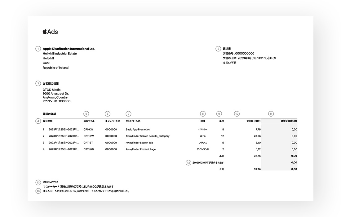 請求書の請求額は、Apple Adsのダッシュボードに表示される支出額とわずかに異なる場合があることに注意してください。これは、クレジットカードの請求にはUTCが使用されるのに対し、アカウントでは広告主様が選択したタイムゾーンが使用されるためです。また、Apple Adsがクレジットカードの決済手数料を請求することはありませんが、クレジットカード事業者が外国取引手数料を請求する場合があります。外国取引手数料が適用されるケースに関するご質問は、クレジットカード事業者までお問い合わせください。請求された外国取引手数料に対しApple Adsが返金やクレジット発行を行うことはありません。