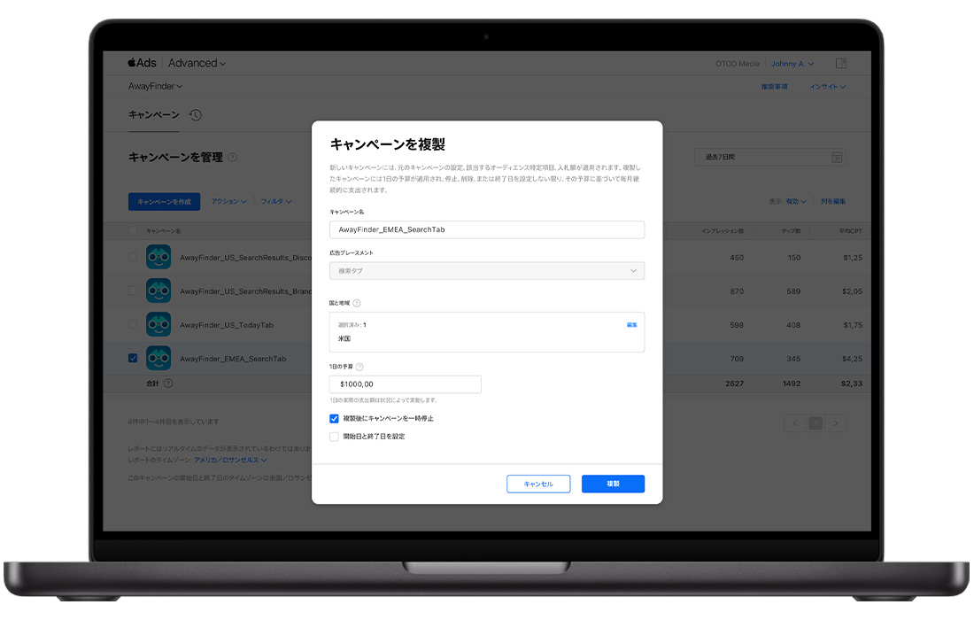 キャンペーンは、同じタイプの広告プレースメントにしか複製できません。検索結果キャンペーンは検索結果キャンペーンとしてのみ、TodayタブキャンペーンはTodayタブキャンペーンとしてのみ複製できます。