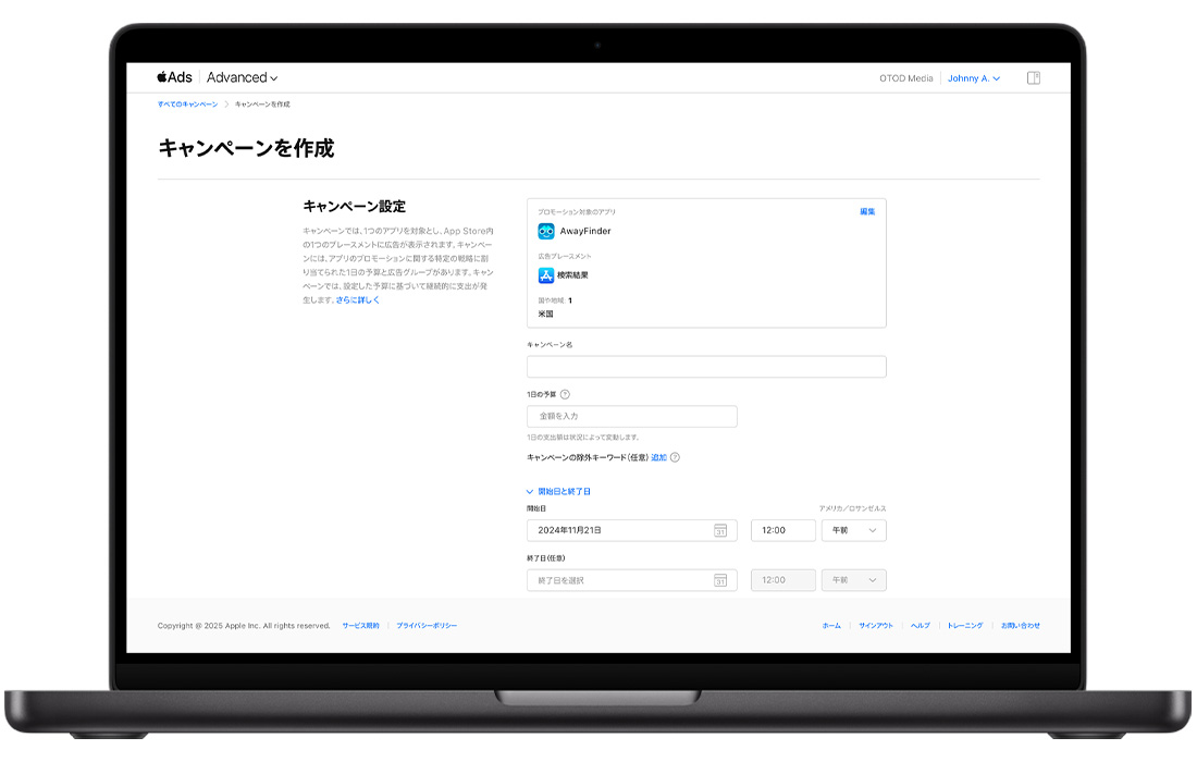 Apple Adsキャンペーンのスケジュールは、キャンペーン作成時、またはキャンペーン設定の編集から設定することができます。キャンペーンのスケジューリング機能は、季節的なプロモーション、期間や時間が細かく区切られたマーケティングキャンペーン、イベントで役立ちます。たとえば、毎年恒例のイベントに対応するアプリを扱っている場合、そうしたイベントに合わせてキャンペーンのスケジュールを設定できます。
