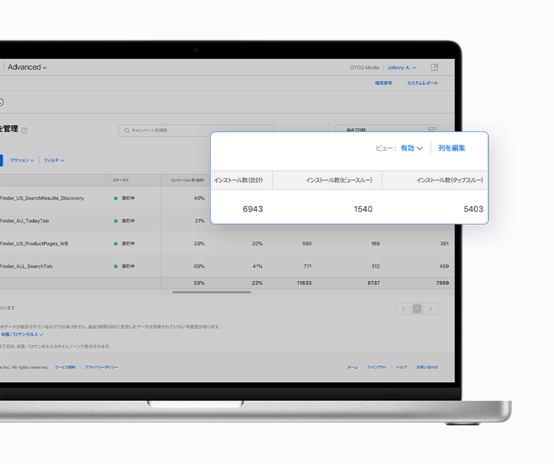 各キャンペーンと広告プレースメントが全体的なパフォーマンスに与える影響をご確認いただけます。Apple Search Adsダッシュボードでビュースルー指標をご確認ください。
