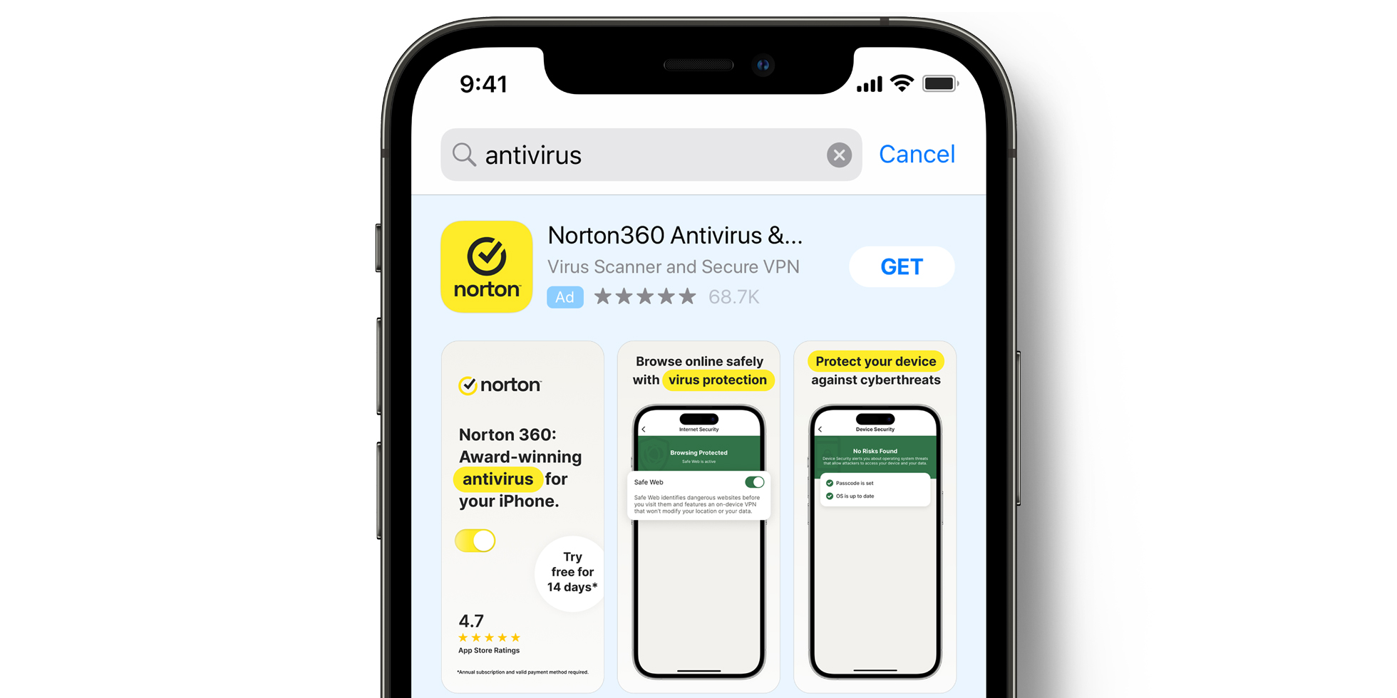 Norton 360 Appの主な機能をわかりやすく紹介し、サブスクリプション登録につながりそうなユーザーに訴えかけるため、Chong + KosterチームはApp Store Connectでセットアップしたカスタムプロダクトページに基づいて広告バリエーションを作成しました。こうしたカスタム広告によって、クリエイティブと成果の高いキーワード広告グループがマッチするようになり、さまざまなユーザーの関心に沿ってApple Adsが機能するようになりました。たとえば、「ウイルス対策」というテーマに合う画像を強調して示し、Appの最も人気のある機能の1つである、個人ユーザーがデバイスをウイルスから守ることができるツールを紹介していきました。