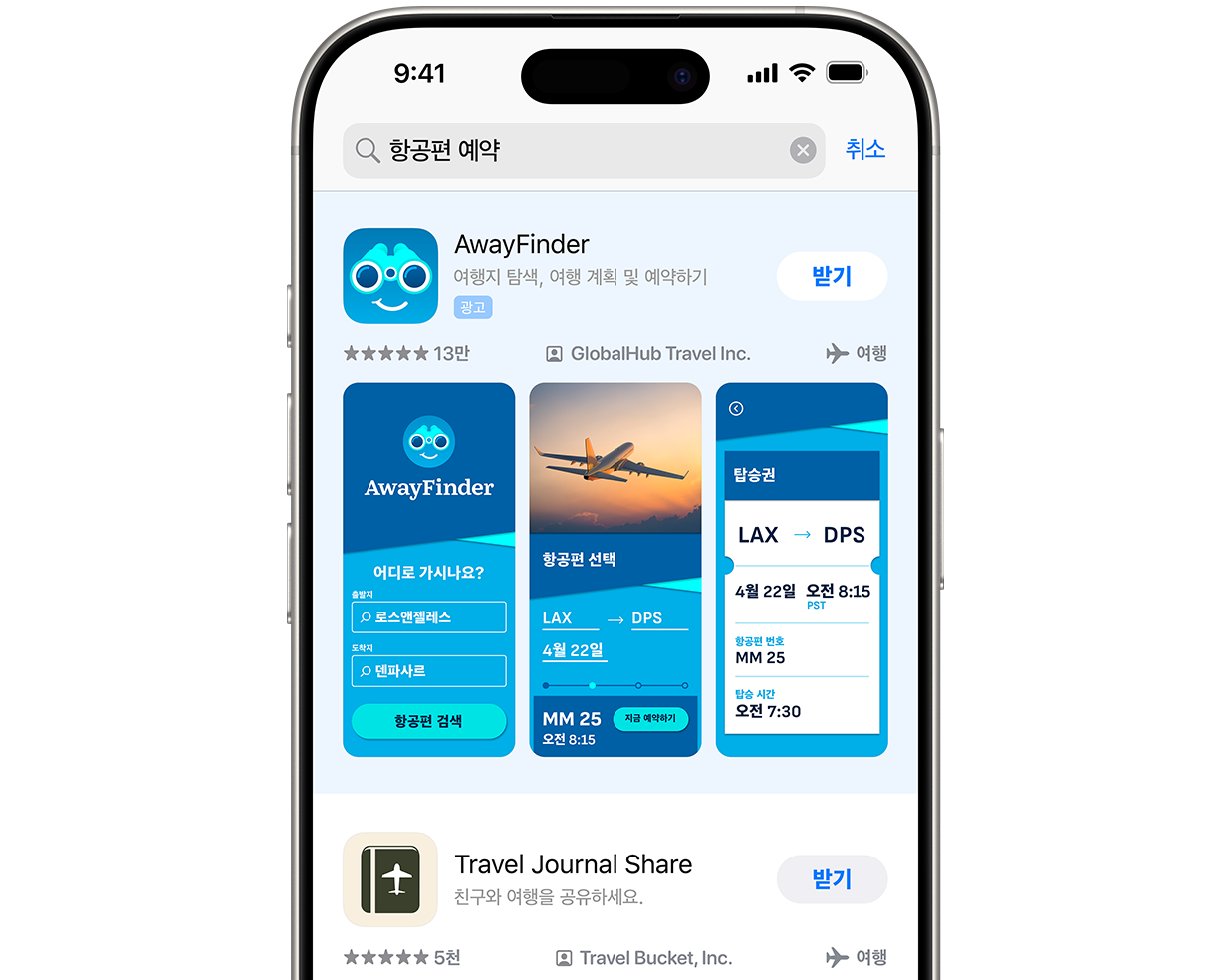 iPhone에 App Store가 열려 있습니다. 검색 상자에 검색어 '항공편 예약'이 입력되어 있고, 검색 결과 상단에 예제 여행 앱 AwayFinder에 대한 광고가 표시되어 있습니다.