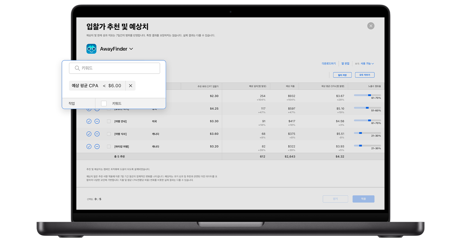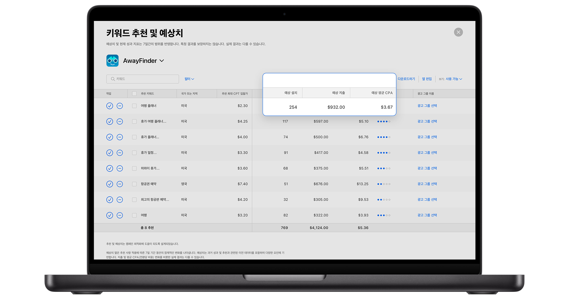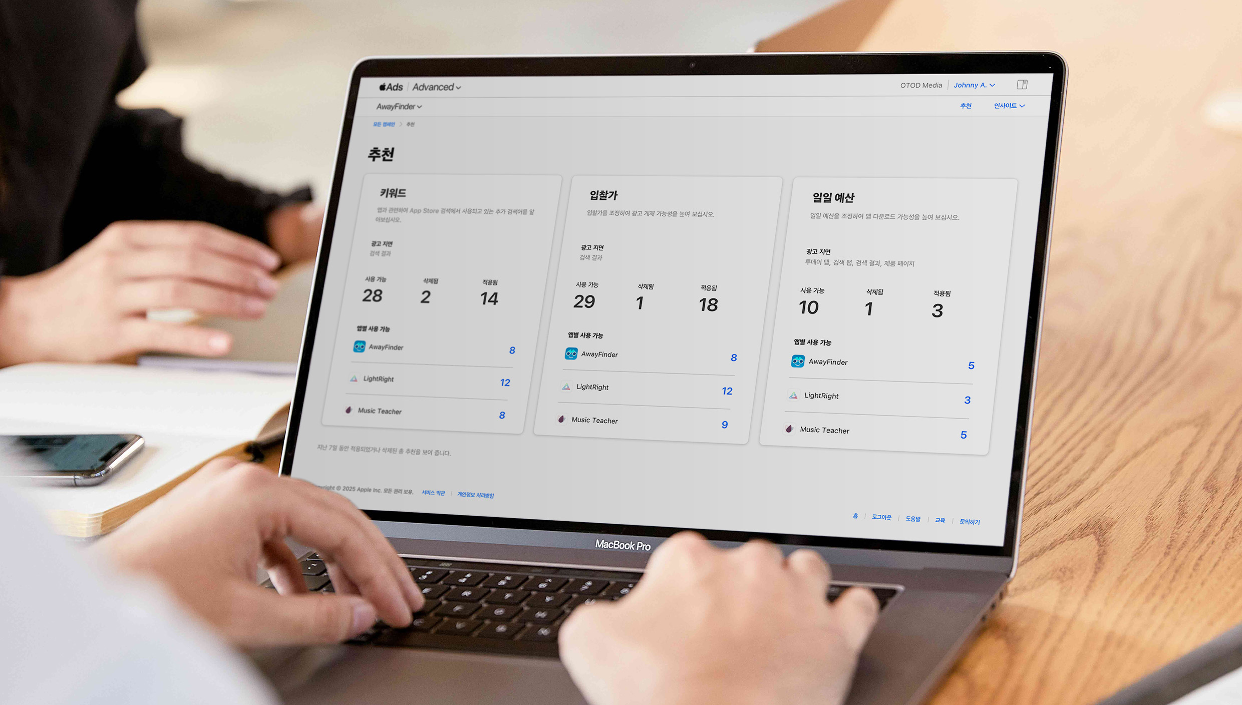 Apple Ads는 추천 사항을 매일 업데이트합니다. 검색 결과 광고에 대한 최신 키워드 및 입찰가 추천 사항을 지속적으로 확인하고, 모든 광고 지면에 대한 일일 예산 추천 사항을 확인할 수 있습니다.