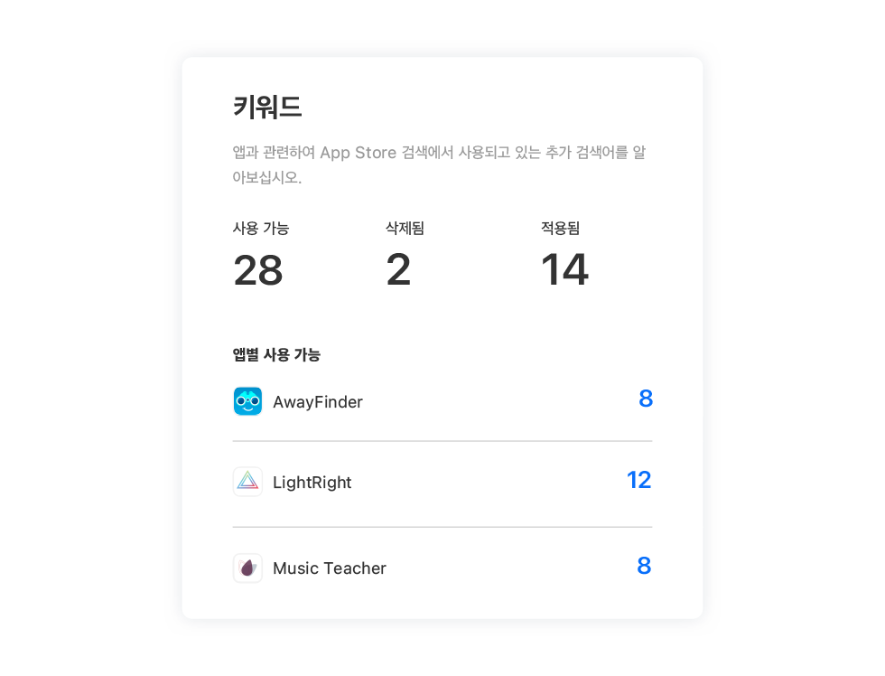 얼마나 많은 사람들이 App Store에서 해당 키워드를 검색하고 있는지에 기반하여 각 키워드의 인기도를 파악합니다. 검색 인기도는 1~5로 표시되며, 5가 가장 인기가 높은 것입니다. 이 지표를 확인하면 키워드 기회를 더 정확하게 평가할 수 있습니다.