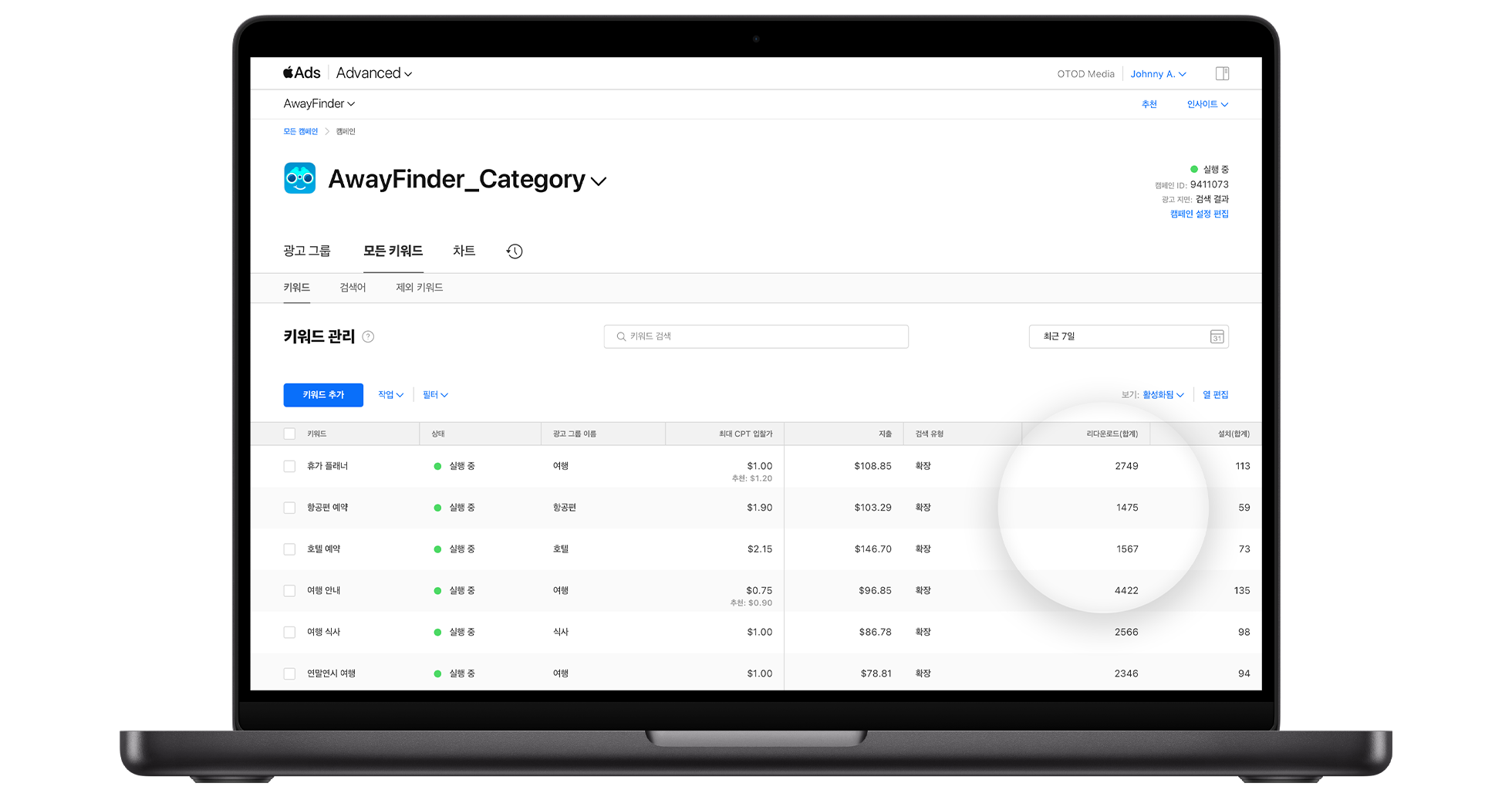 Apple Ads에서는 모든 키워드 대시보드 및 광고 그룹 키워드 대시보드에 표시되는 설치 횟수에 재다운로드 지표를 포함합니다. 고객이 앱을 다운로드했다가 삭제한 다음, App Store에서 광고를 탭한 후 동일한 앱을 다시 다운로드하는 경우 재다운로드로 계산됩니다. 또는 동일한 앱을 추가 기기에 다운로드하는 경우에도 재다운로드로 간주됩니다. 재다운로드 지표를 모니터링하여 재방문 사용자에게 가장 효과적인 키워드를 파악하고 정확한 정보를 토대로 최적화에 대한 결정을 내릴 수 있습니다.