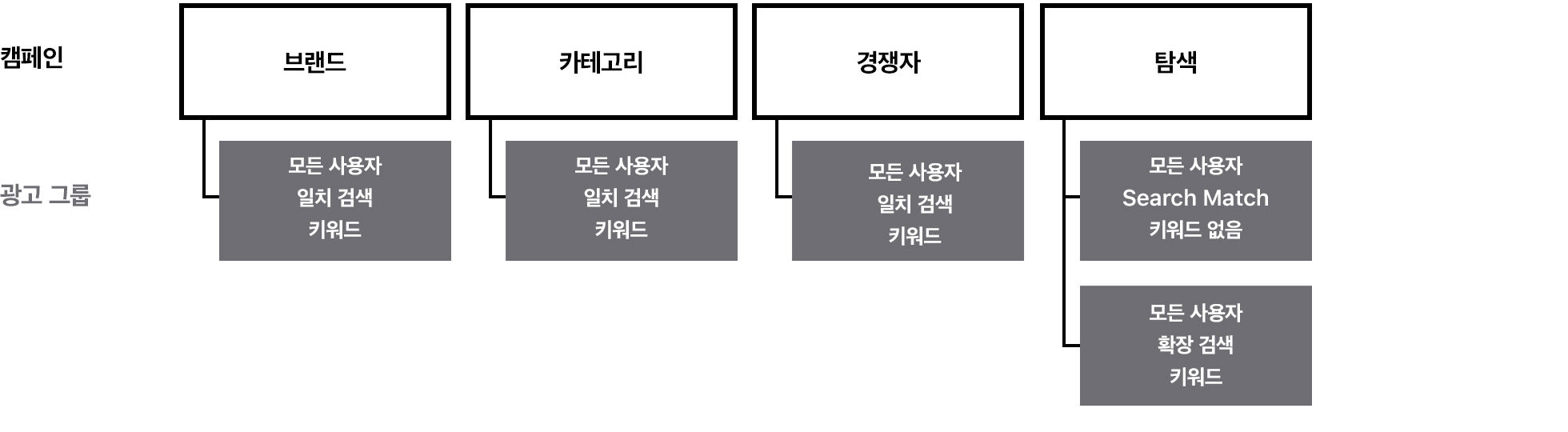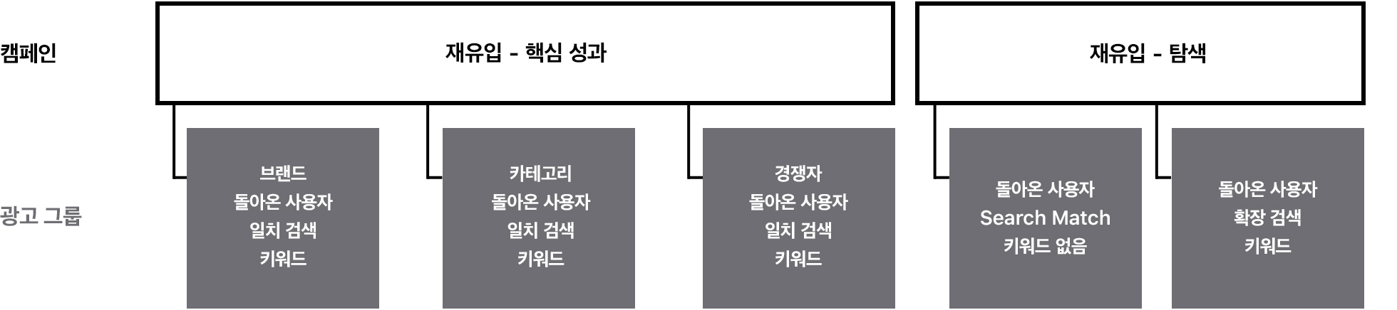 재전환 예산을 별도로 관리하려면 모든 광고 그룹이 '재방문 사용자' 고객 유형으로 설정된 전용 캠페인을 생성합니다. 이 구조를 사용하면 이전 고객을 위한 키워드, 입찰가, 광고를 사용자화할 수 있습니다. 탐색 광고 그룹에서 성과가 좋은 용어를 파악하면 해당 용어를 나머지 광고 그룹에 키워드로 포함합니다.