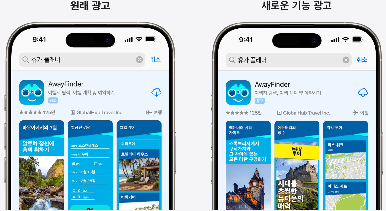 AwayFinder라는 여행 앱이 있고, 새로운 도보 여행 기능을 선보이고자 한다고 가정해 보겠습니다. 새로운 이미지를 App Store Connect에 업로드하여 광고에서 이 새로운 기능을 신규 고객과 이전 고객 모두에게 홍보할 수 있습니다.