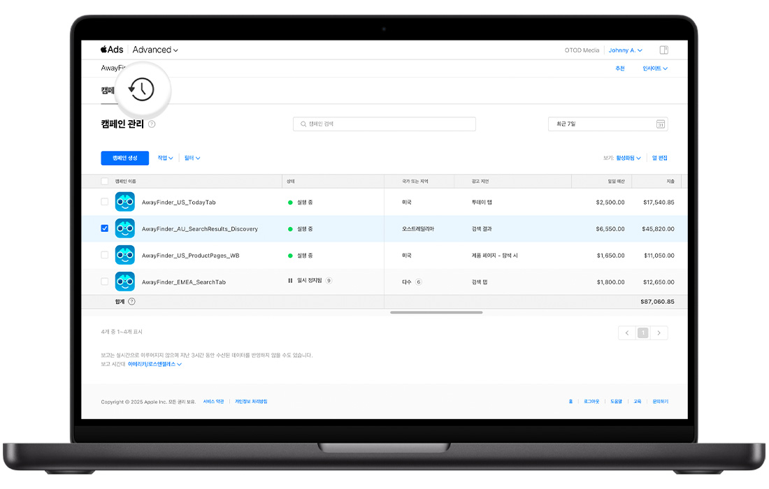 Apple의 분석 엔진을 사용하여 계정 전체의 데이터를 살펴볼 수도 있습니다. 인사이트(베타)는 모든 광고 게재 위치에 걸친 캠페인들의 전반적인 영향을 종합적으로 분석하여, 보다 정확한 의사결정을 내리는 데 도움을 줍니다. 인사이트(베타)를 사용하면 비즈니스 목표에 가장 중요한 지표를 시각화하여 막대 그래프, 꺾은선형 차트 등으로 자세한 데이터를 확인할 수 있습니다.