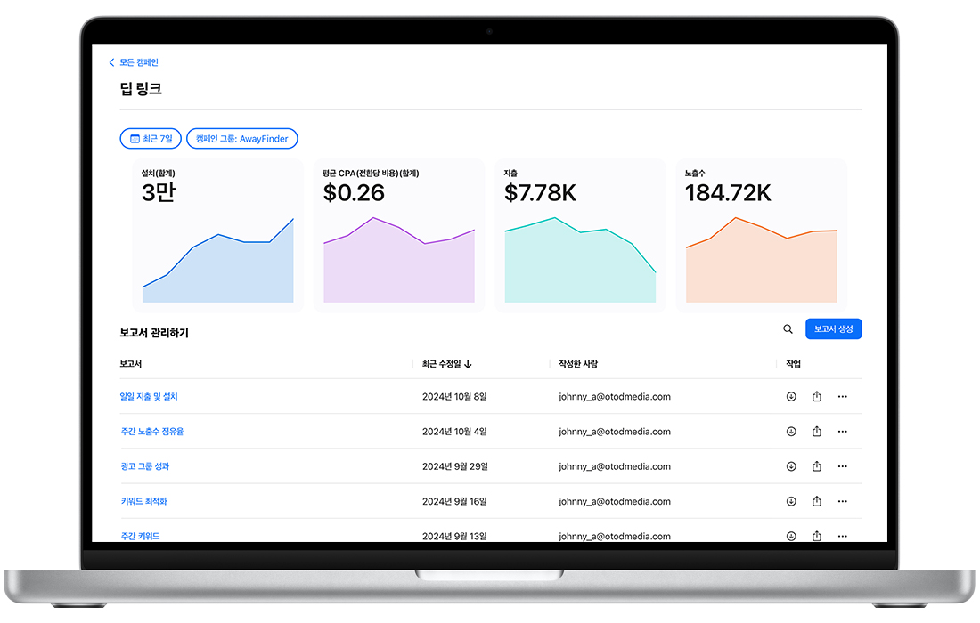 - 캠페인 보고서: 광고 지면 및 캠페인 그룹 전체에 걸쳐 앱별 캠페인 레벨 데이터를 확인합니다.