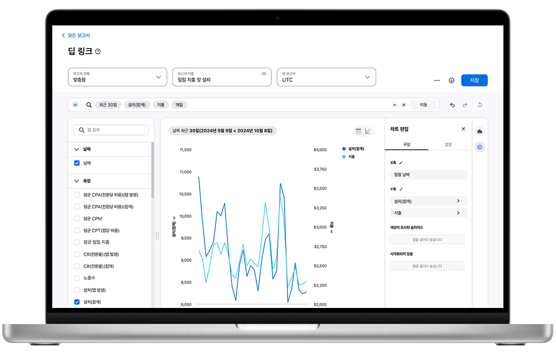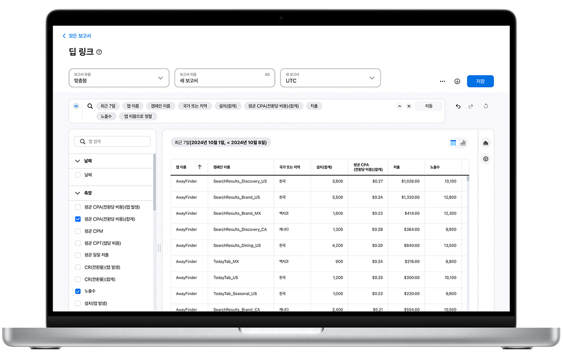 | 측정 | 평균 CPA(탭 기반), 평균 CPA(전체), 평균 CPM, 평균 CPT, 평균 일일 지출, CR(탭 기반), CR(전체), 노출수 점유율, 노출수, 설치(탭 기반), 설치(전체), 설치(노출 기반), 신규 다운로드(탭 기반), 신규 다운로드(전체), 신규 다운로드(노출 기반), 순위, 리다운로드(탭 기반), 리다운로드(전체), 리다운로드(노출 기반), 검색 인기도, 지출, 탭, TTR(노출 대비 탭 발생 비율) |