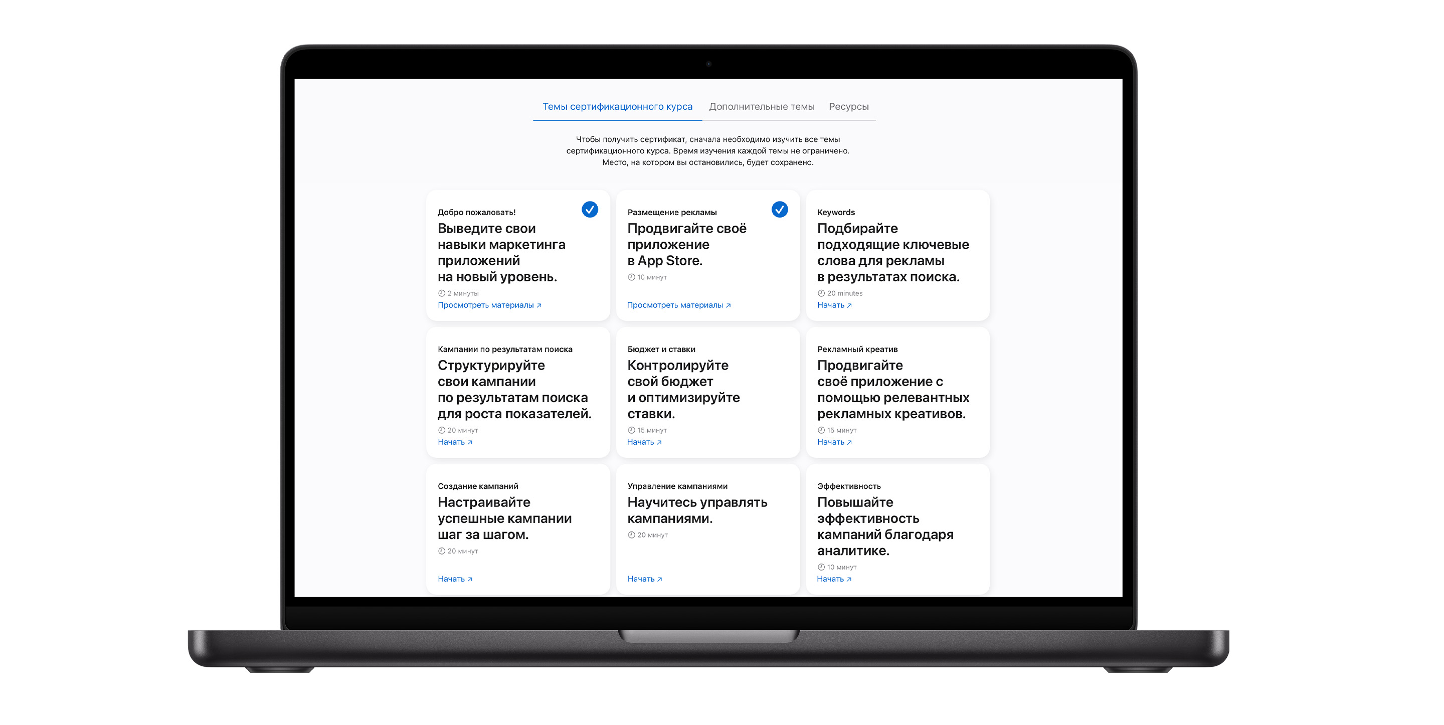Сертификация Apple Ads — это бесплатный онлайн-курс, на котором вы научитесь эффективно продвигать своё приложение и охватывать ещё больше пользователей в App Store. Наши уроки содержат проверенные рекомендации, которые помогут вам увеличить эффективность кампаний. Каждый урок занимает примерно 10–20 минут.