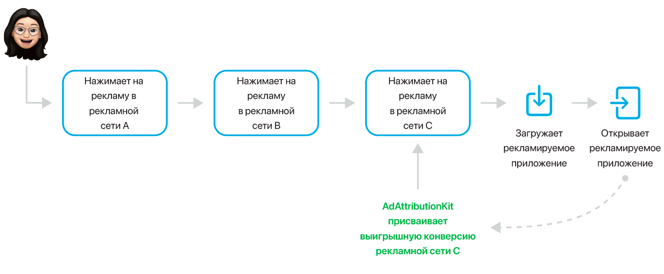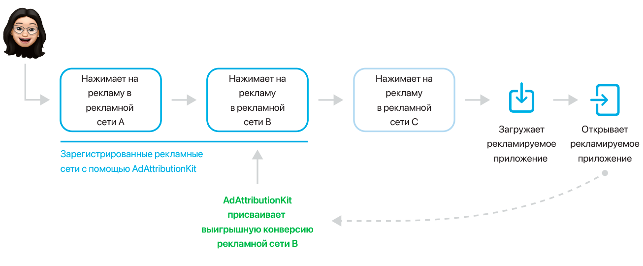 Например, пользователь может просмотреть и нажать на рекламу их рекламной сети A, рекламной сети B и рекламной сети C в указанном порядке. После того как пользователь нажимает на рекламу из рекламных сетей A и B, он не загружает приложение. Но после нажатия на рекламу из рекламной сети C приложение загружается и открывается. Если все три рекламные сети зарегистрированы в AdAttributionKit, AdAttributionKit будет атрибутировать конверсию этого приложения к рекламной сети C, так как в ней было размещена реклама, которую пользователь нажал последней перед конверсией.