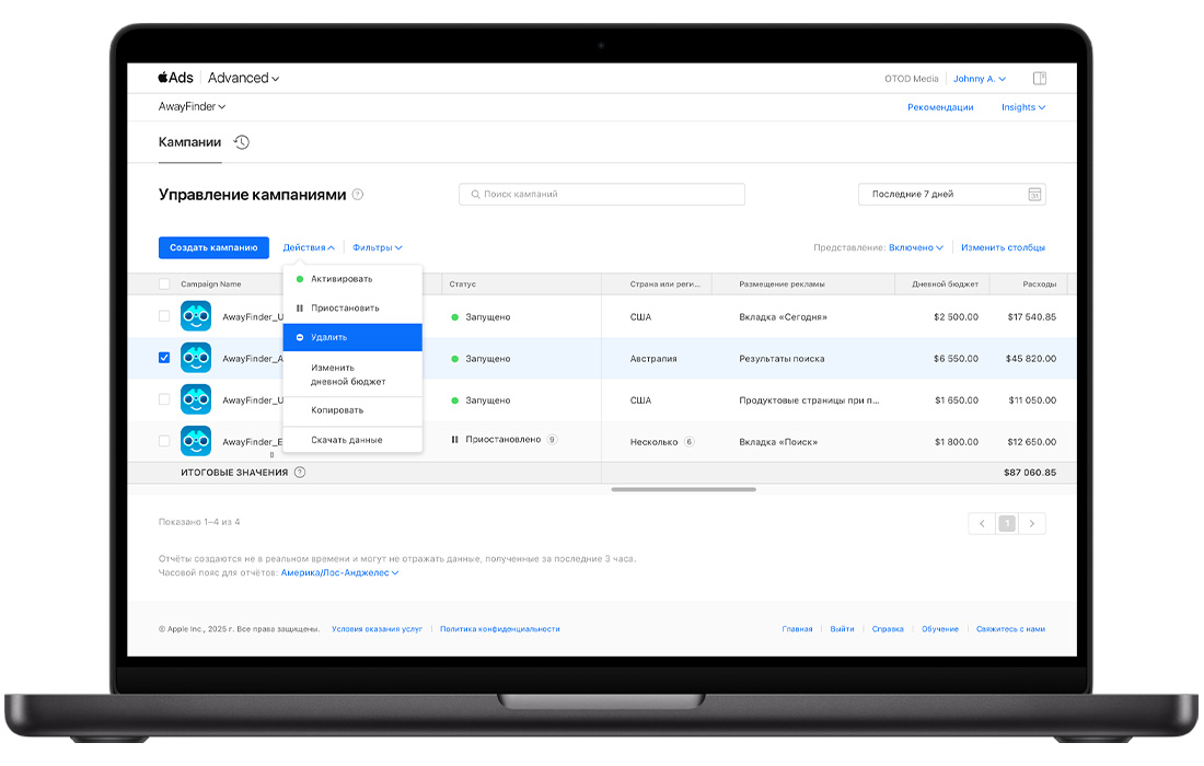 После удаления активной кампании демонстрация соответствующей рекламы будет полностью прекращена. Удалённые кампании можно просматривать, переключаясь между представлениями «Включено», «Удалено» и «Все» в меню «Представление» панели «Кампании» в правой части экрана.