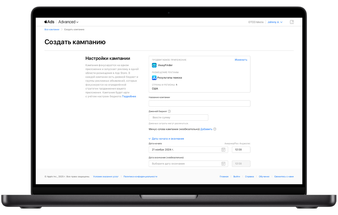 Создать расписание для кампаний Apple Ads можно на этапе их создания или позднее, изменив настройки кампании. Расписание кампаний используется для сезонных акций, ограниченного по времени маркетинга и для определённых событий. Например, если у вас есть приложение, созданное для ежегодного события, вы можете запланировать проведение кампании на соответствующие даты.