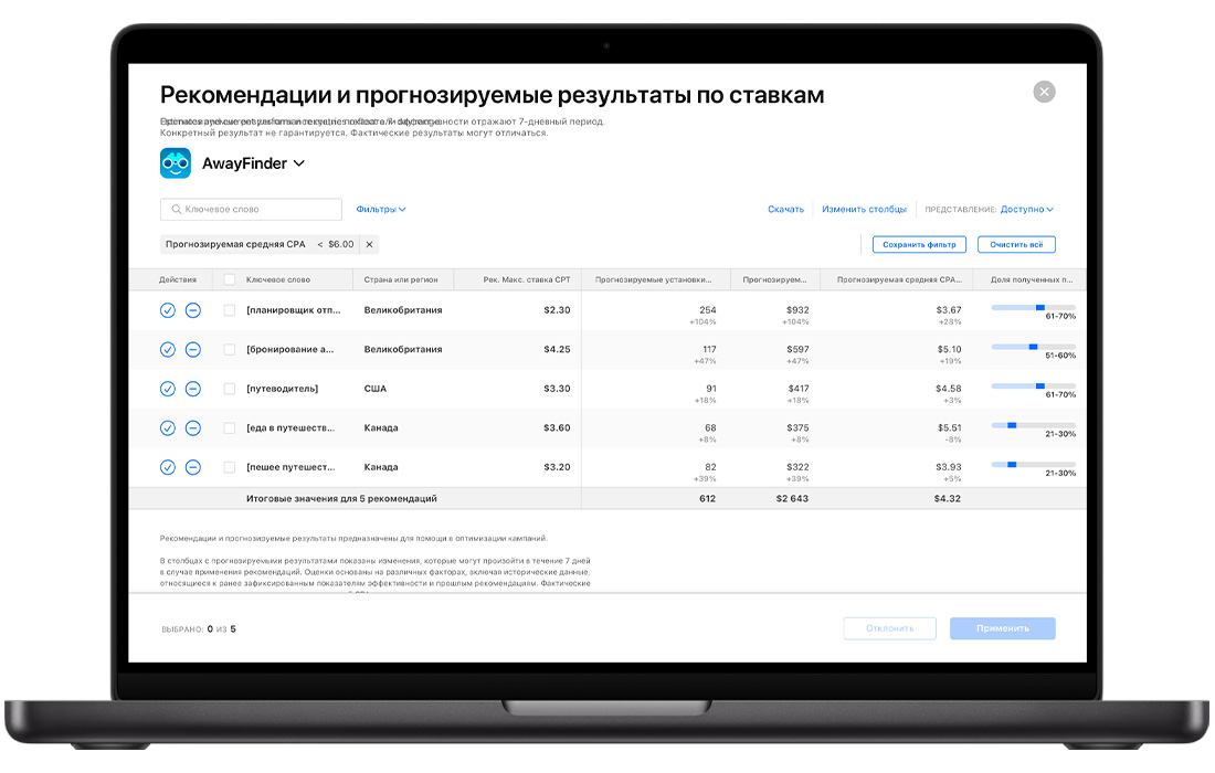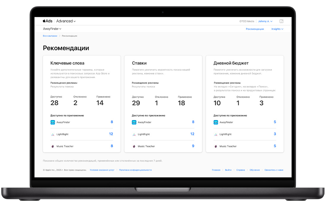 Просмотр индивидуальных рекомендаций для кампаний Apple Ads