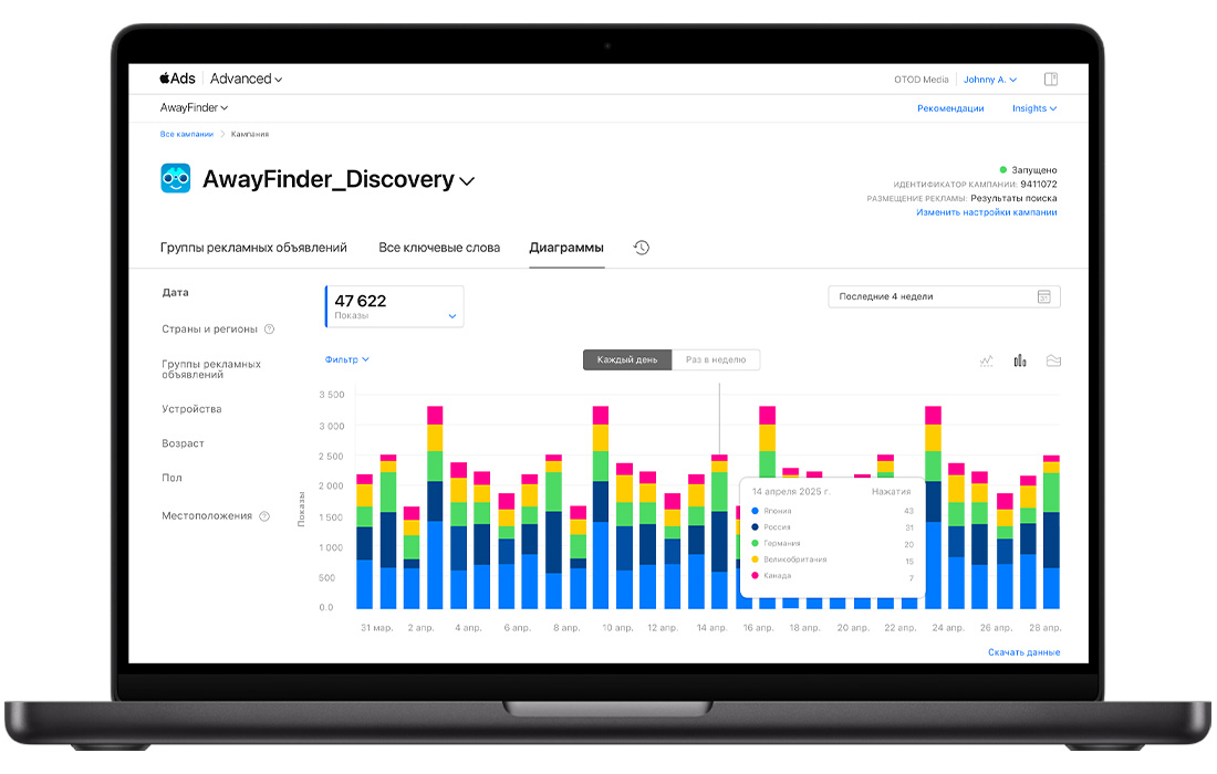 Панель «Диаграммы» Apple Ads позволяет просматривать данные об эффективности по дате, странам и регионам, группам рекламных объявлений, ключевым словам, устройствам или настройкам аудитории, а также строить графики по следующим показателям: