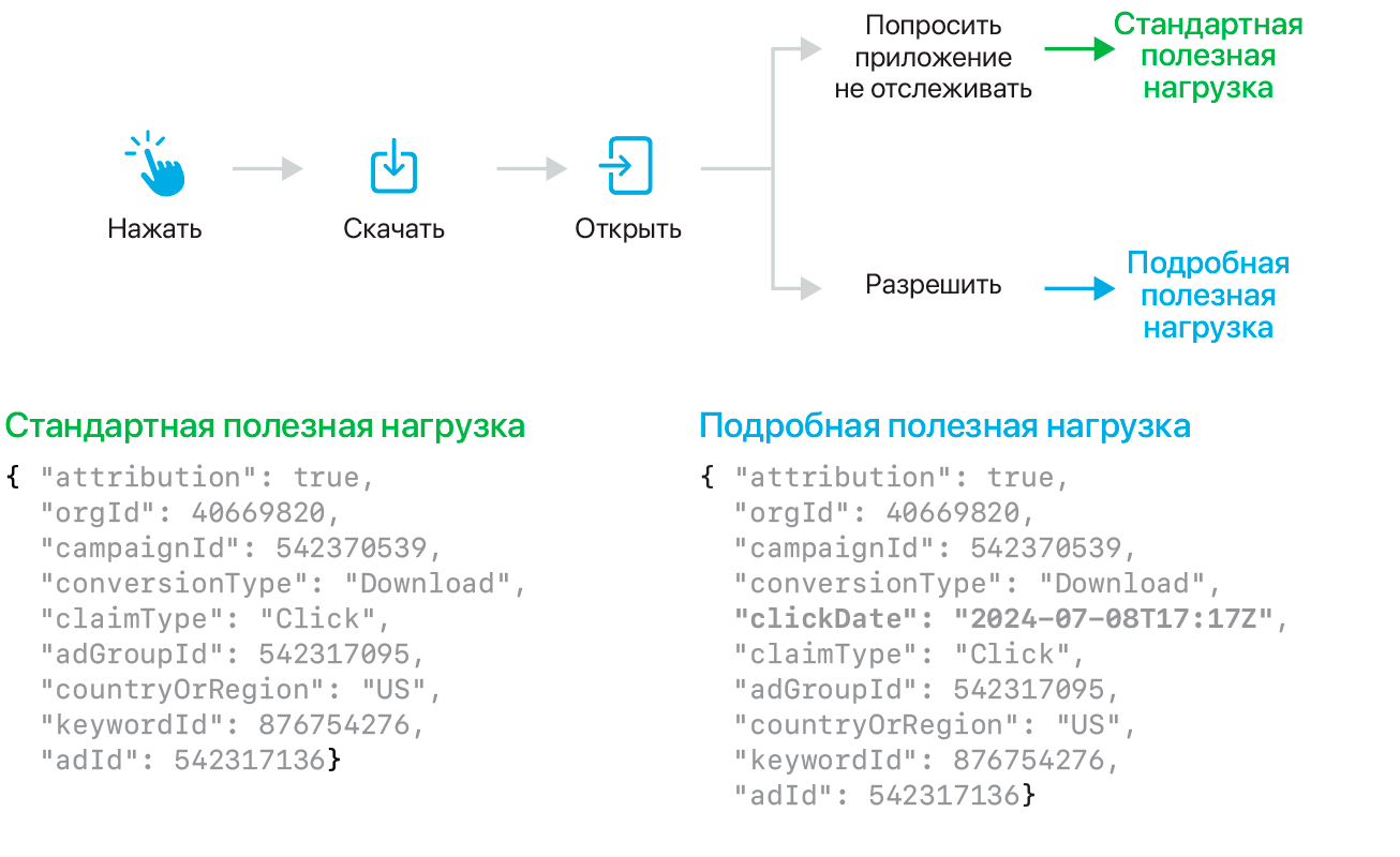 AdServices отправляет сведения об атрибуции рекламодателю, когда пользователь открывает рекламируемое приложение, предоставляя один из двух наборов информации, известных как полезные данные. Возвращаемые полезные данные могут быть «стандартными» или «подробными», и в обоих случаях предоставляется информация, которая не позволяет идентифицировать пользователя или устройство. Разница между этими двумя полезными данными заключается в поле clickDate или ImpactDate, которое указывает дату нажатия или просмотра объявления. Добавление clickDate или impressionDate в полезные данные отправляется только в том случае, если приложение получило разрешение пользователя на отслеживание через запрос на прозрачность отслеживания в приложениях (ATT).